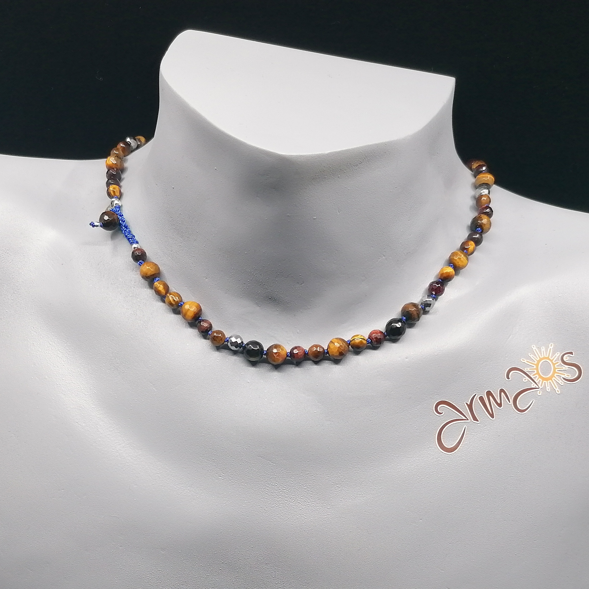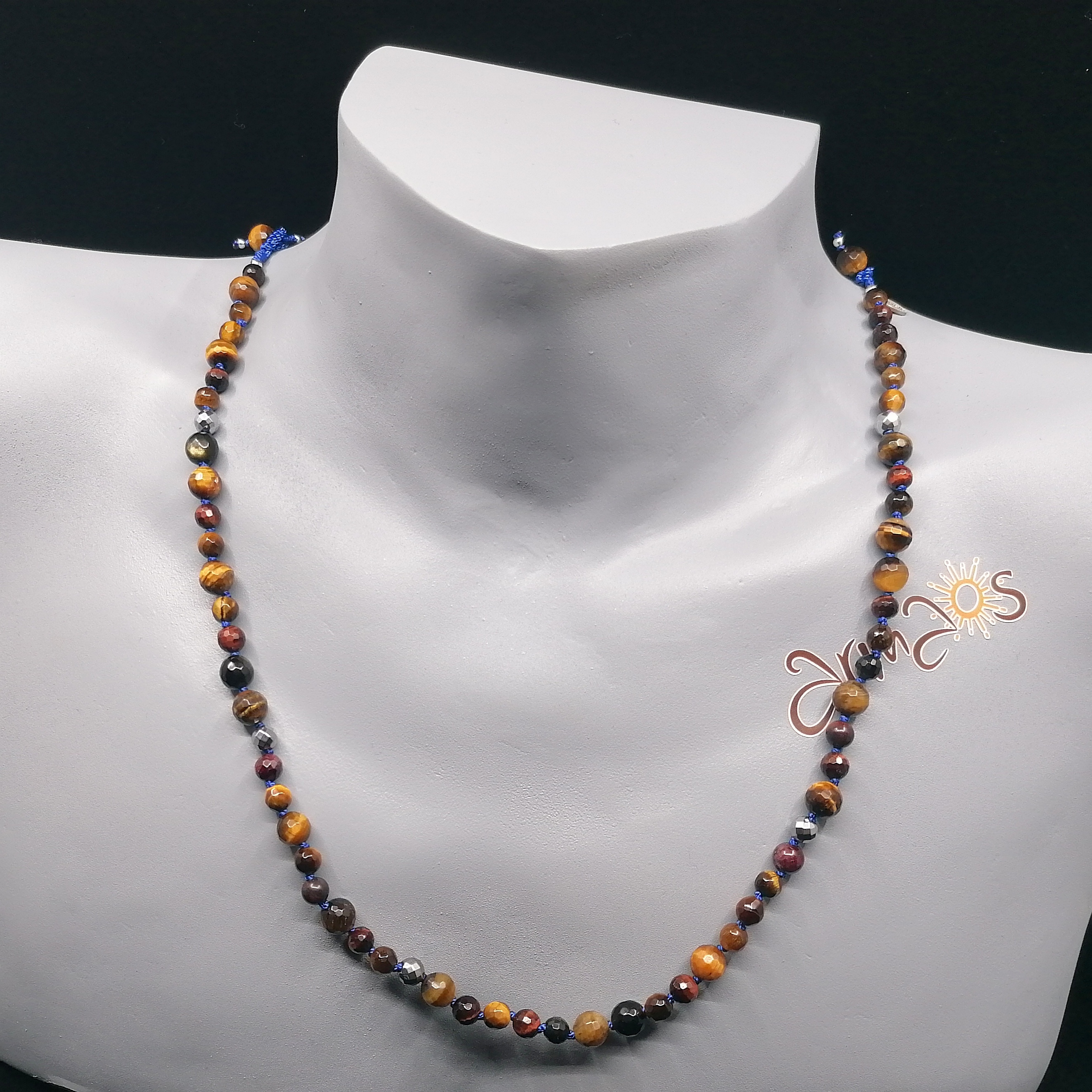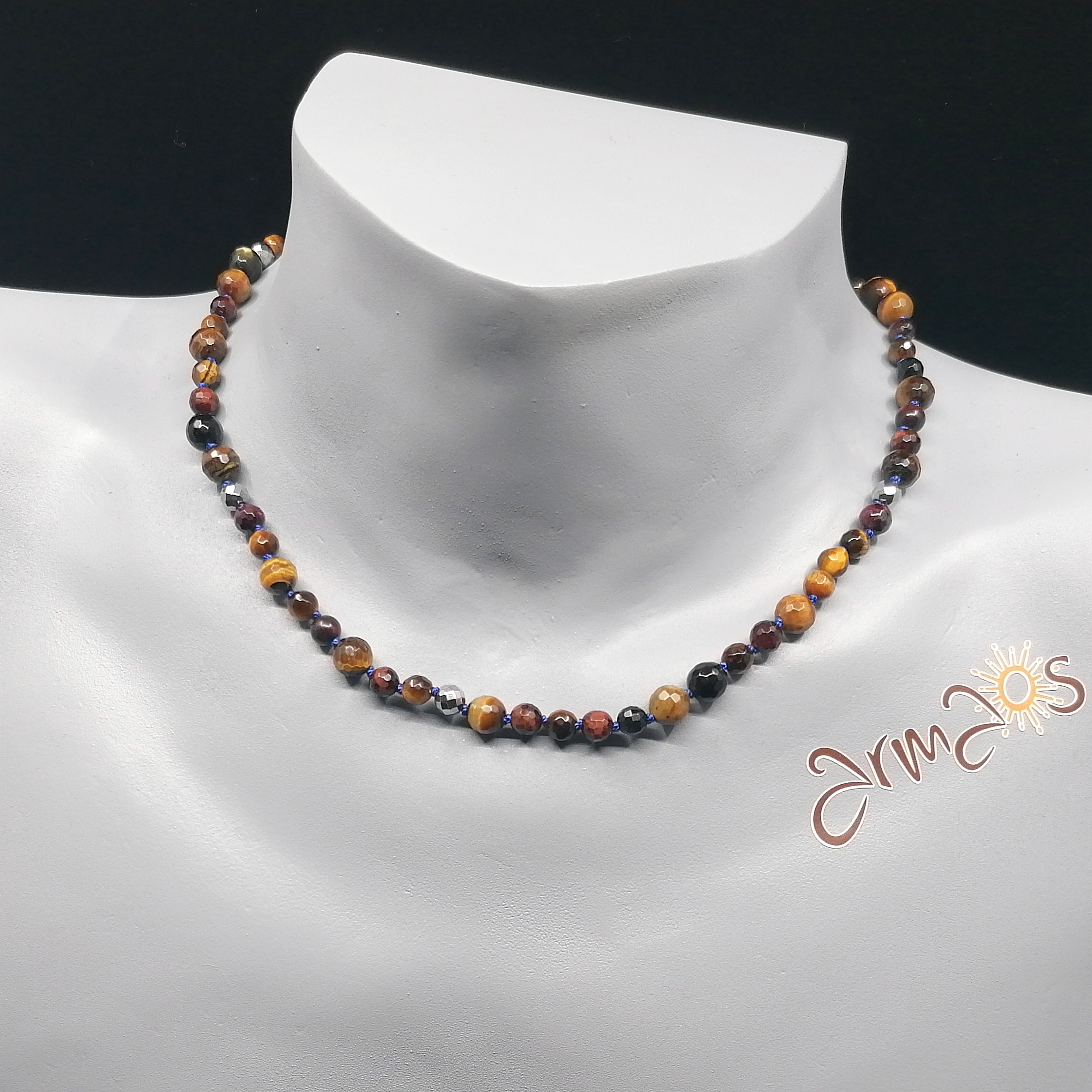 Edelstein Collier Tiger, 62 Edelsteine handgeknüpft, gehäkelter Verschluss, Silber 925, 50cm