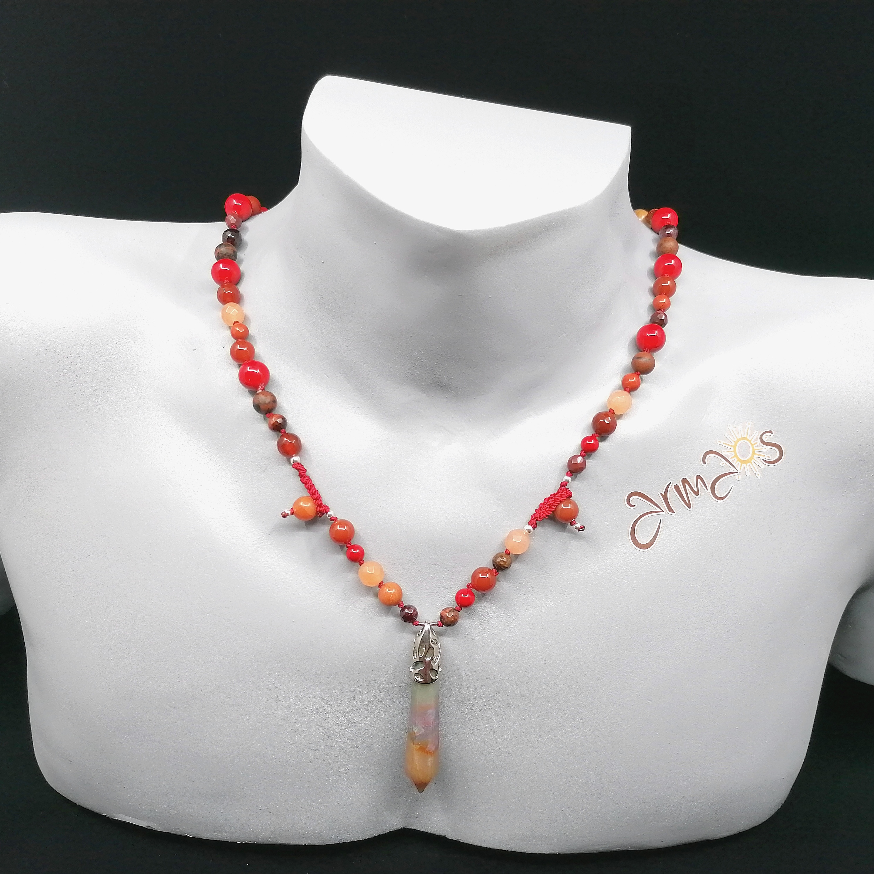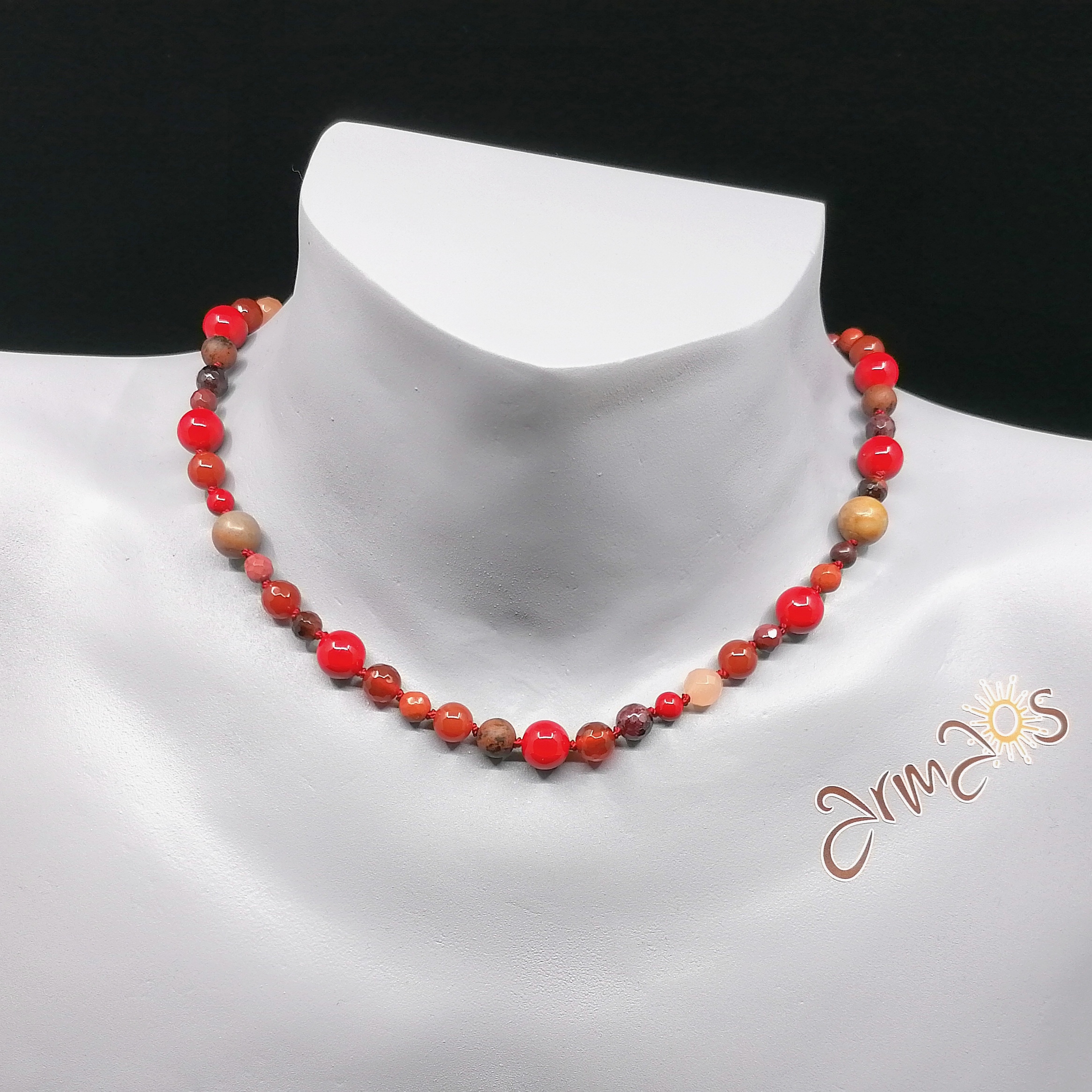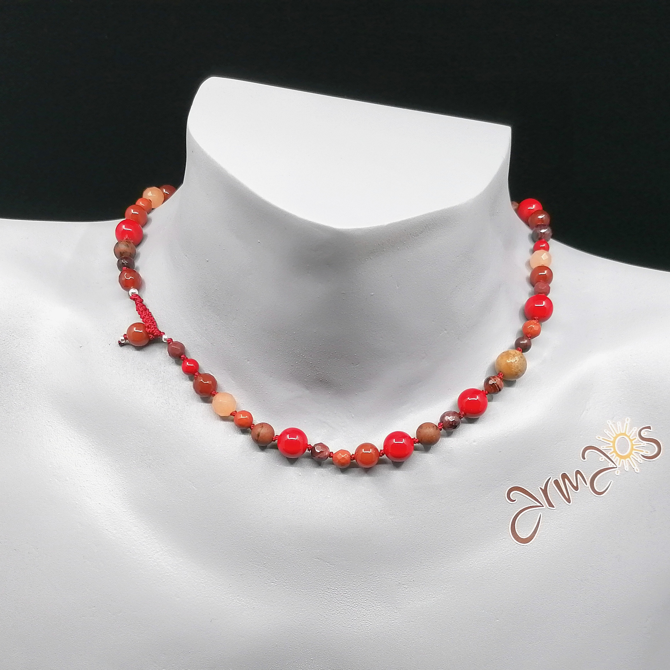 Edelstein Collier Rot, 51 Edelsteine handgeknüpft, gehäkelter Verschluss, Silber 925, 50cm